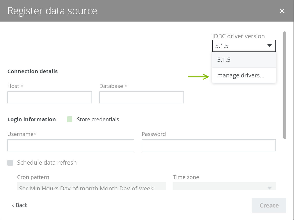The Create dialog box appears. - In the Create dialog box, click Register data source (use a Collibra provided driver).