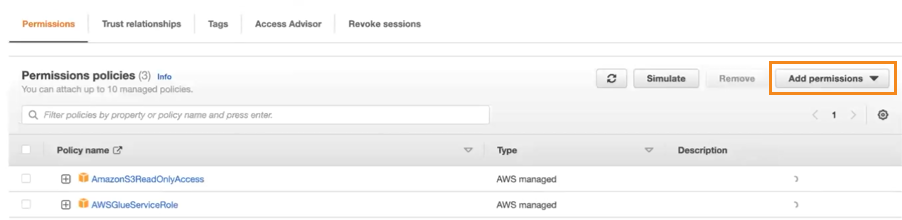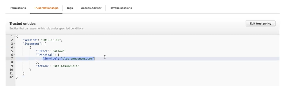• Trusted entities: glue.amazonaws.com