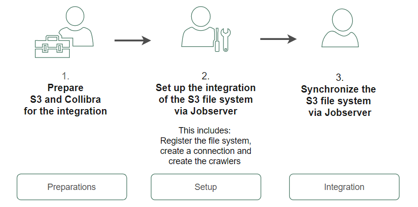 | Preparations | 1 | Prepare the Amazon S3 file system for integration via Jobserver | Prepares the S3 file system for integration in Data Catalog. | You have access keys that you can use during the integration. |