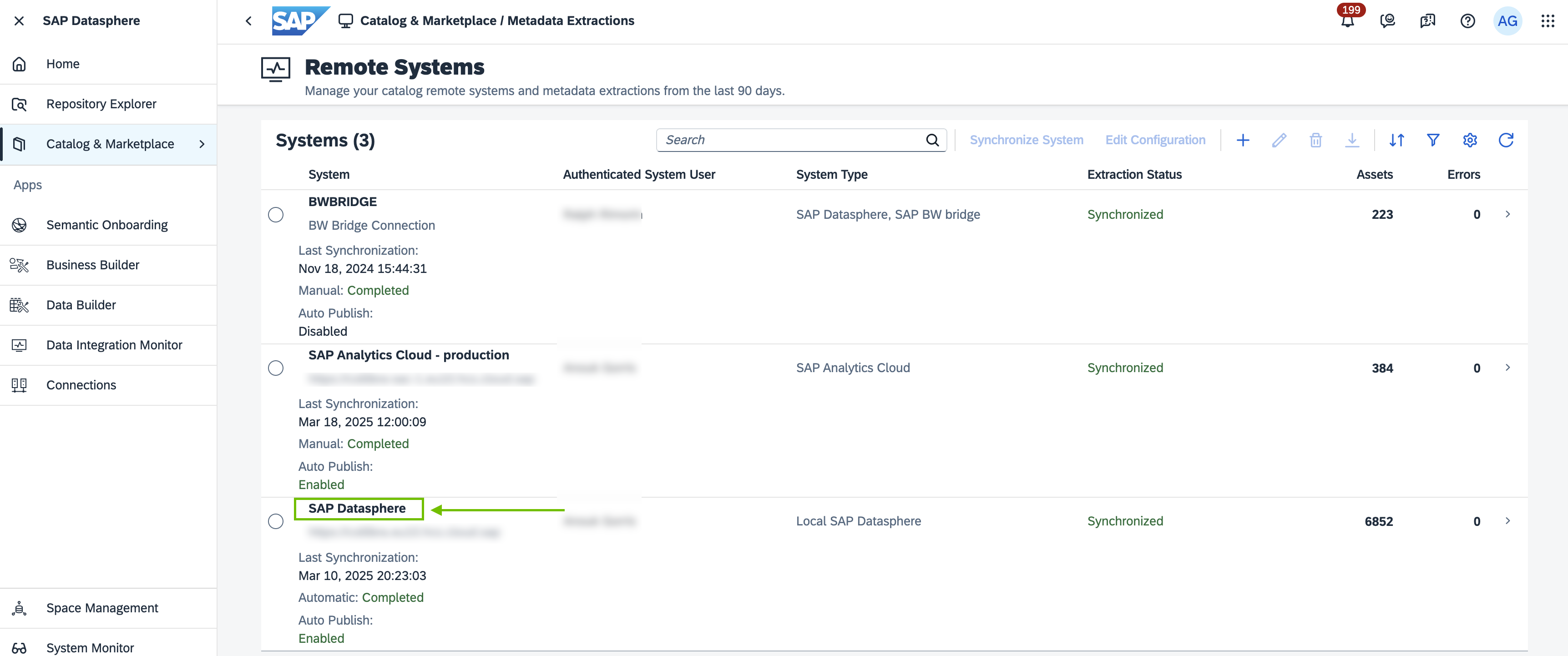 In SAP, on the SAP Datasphere homepage, click Catalog & Marketplace > Metadata Extractions. In the following example image, let's say you want the highlighted system. The name you need to specify is "SAP Datasphere".