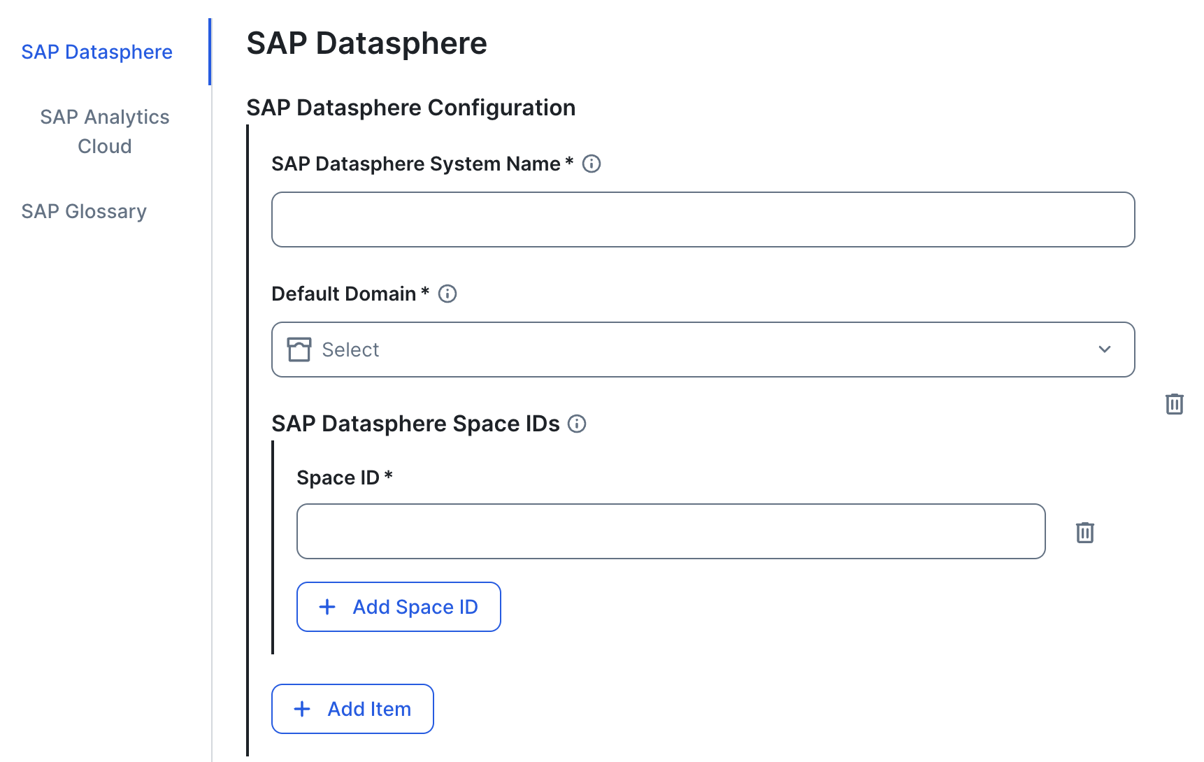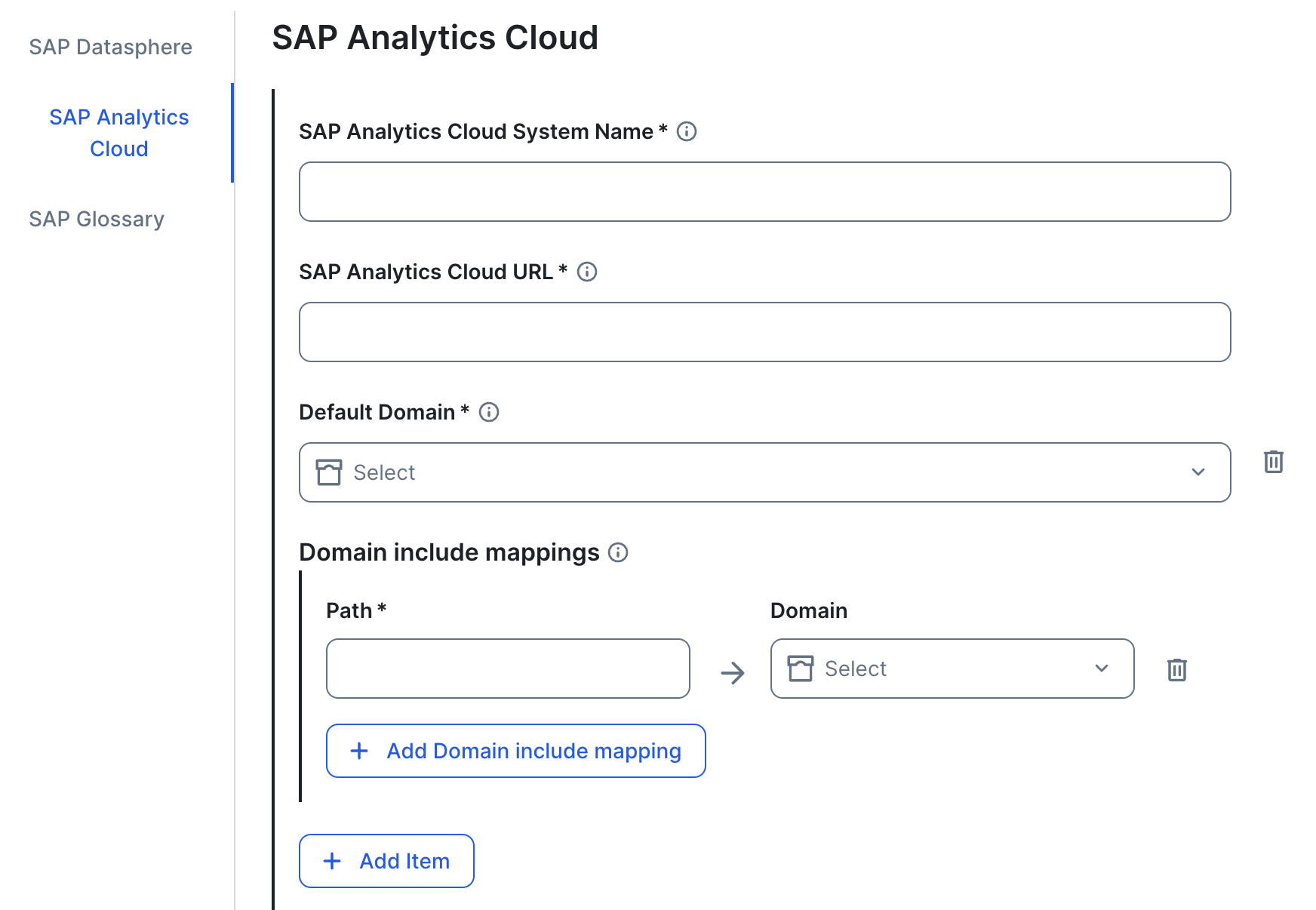 Select a default domain. This is the domain in which glossary terms are ingested if you don't configure one or more glossary mappings. If you don't configure one or more glossary mappings, all terms from all glossaries are ingested in this domain. Important Ensure that the domain you specify is not used for another SAP Datasphere synchronization. Any single Collibra domain can be the target domain of only one synchronization. The + Add Item button is currently not relevant. |