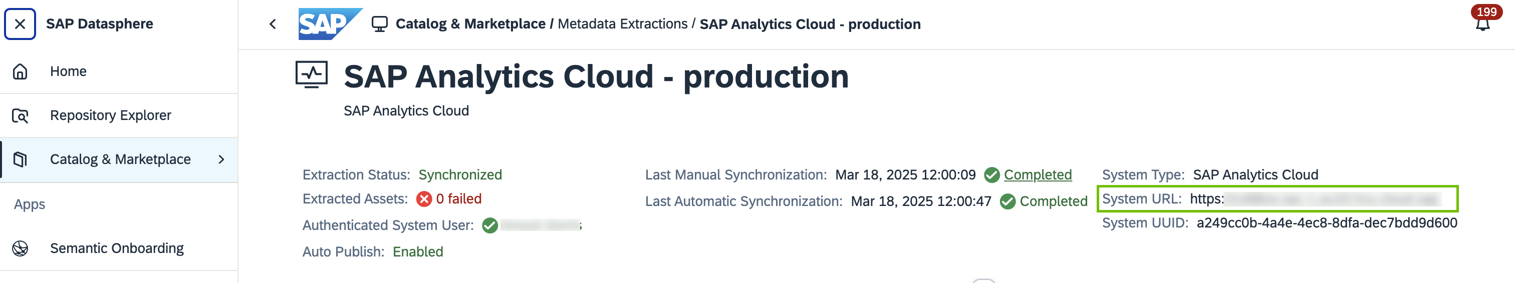 In SAP, on the SAP Datasphere homepage, click Catalog & Marketplace > Metadata Extractions. In the following example image, let's say you want the highlighted system. The name you need to specify is "SAP Analytics Cloud - production".