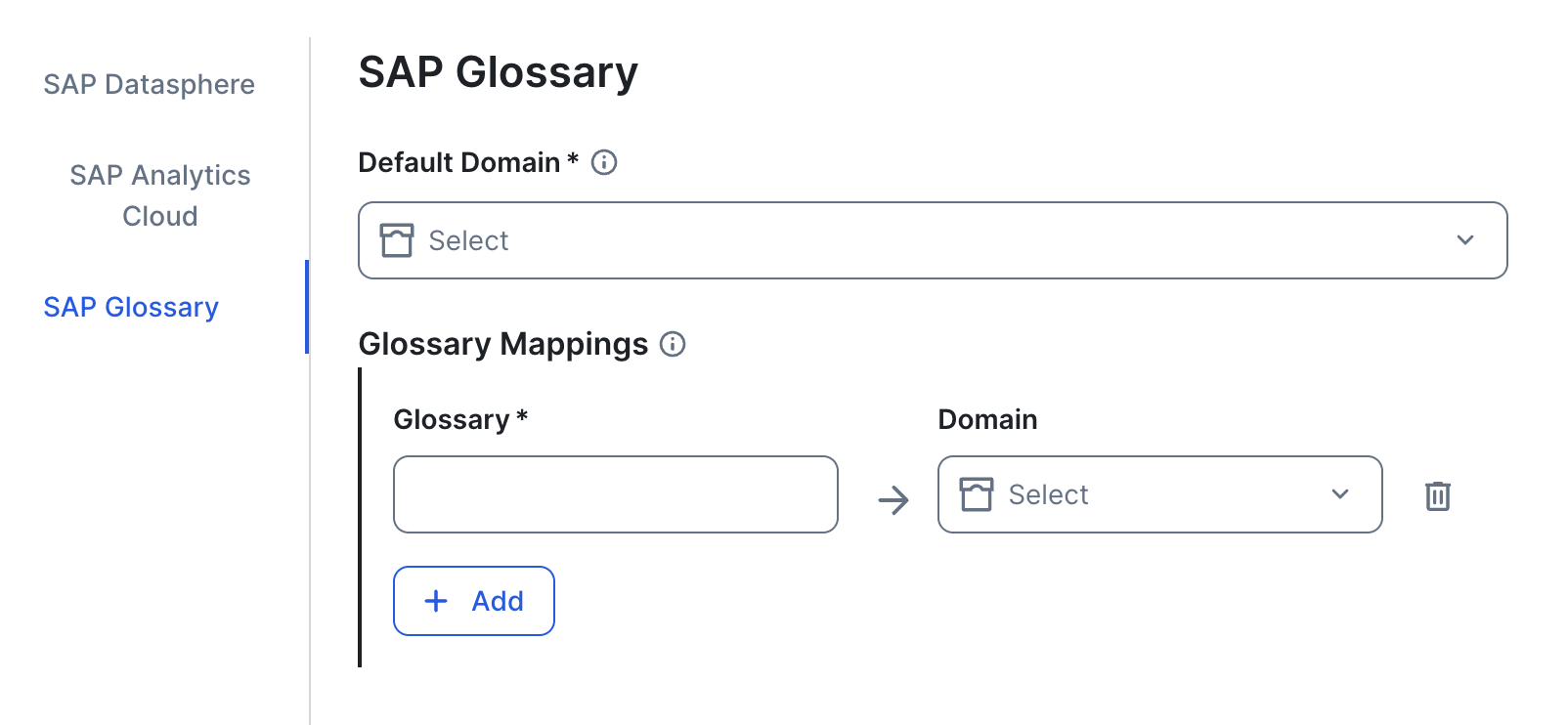 Use mappings to ingest terms from specified glossaries into specified Collibra domains. To add more than one mapping, click + Add. |