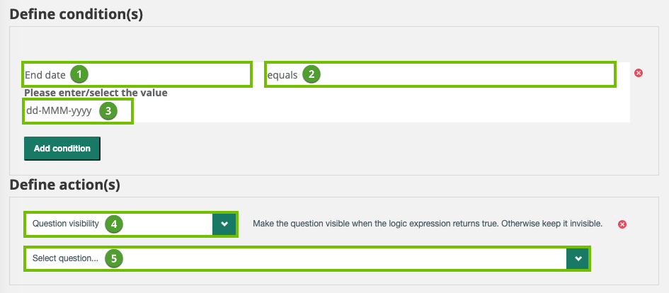 The action that occurs if the conditions are met. Note In the previous example image, the "Question visibility" action has been selected in order to show the Select question... field, which only appears once an action is selected. |