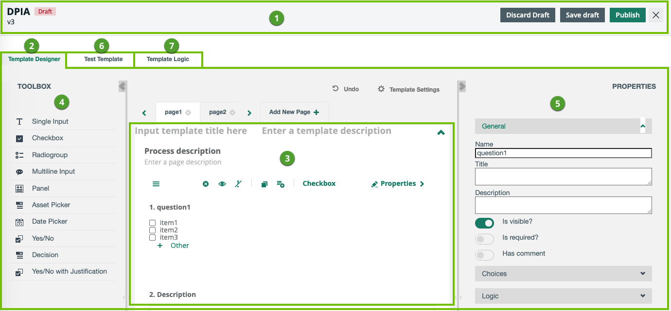 | 1 | Name, version number, and status (Draft or Published) of the template. |