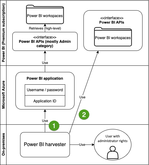 The lineage harvester (deprecated) uses the username, password and application ID to access the Power BI APIs. These APIs retrieve basic Power BI metadata, for example metadata in the Power BI tenant or server and reports. |
