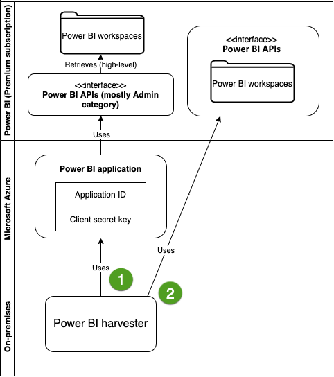 The lineage harvester uses the application ID and the client secret key of the Azure Active Directory application to access the Power BI APIs. These APIs retrieve basic Power BI metadata, for example metadata in the Power BI tenant or server and reports. |