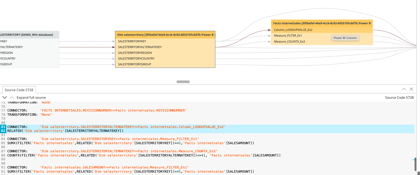 The source code pane opens. Here you can see the DAX query and compare it to the lineage.