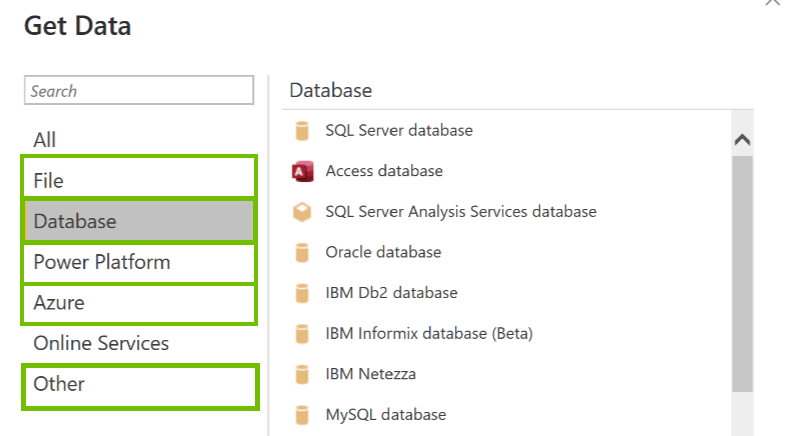 - The three data source types under the Azure tab require either a JDBC or ODBC connection.