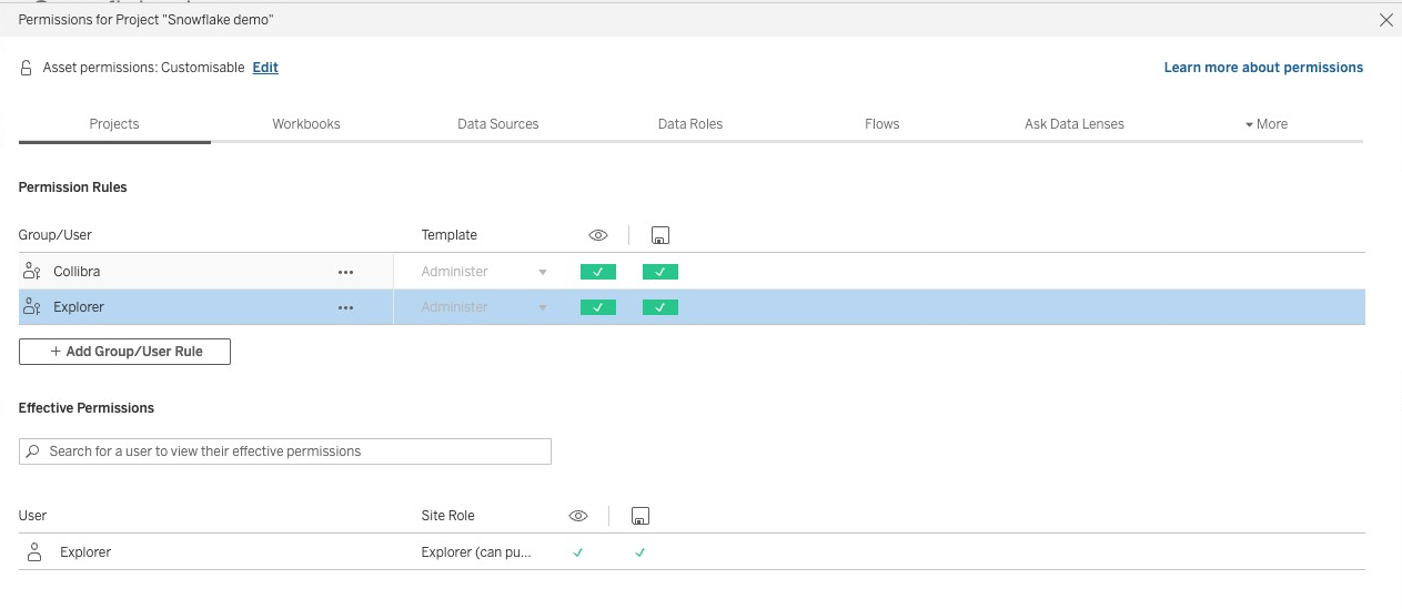 In this section, we address the permissions you need to attain full lineage and automatic stitching when using the Explorer role in Tableau.