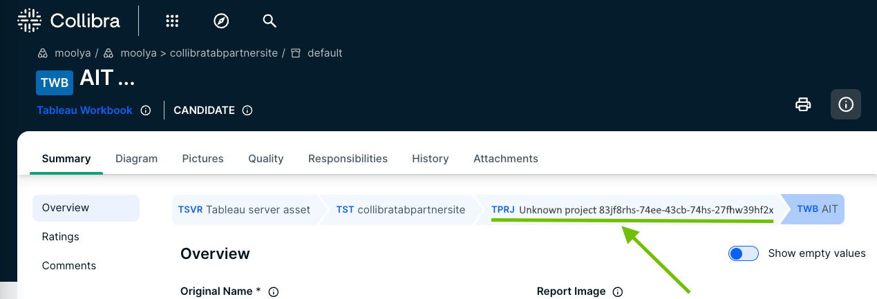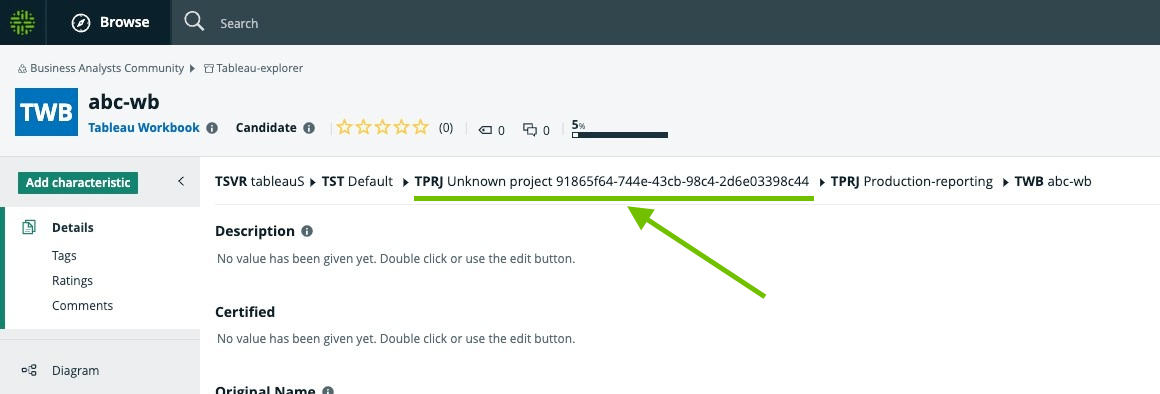 As shown in the following image, if you use the Explorer role and you have access to a subproject, but not the parent project, the parent project is ingested with the Tableau UUID, to maintain the hierarchy of assets.