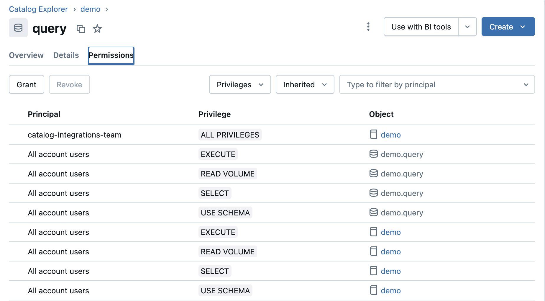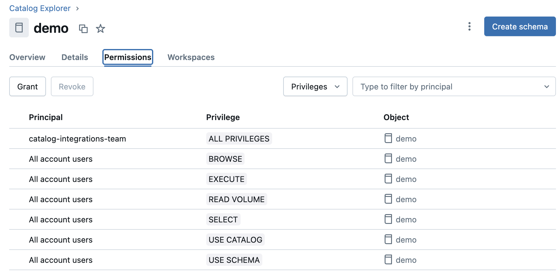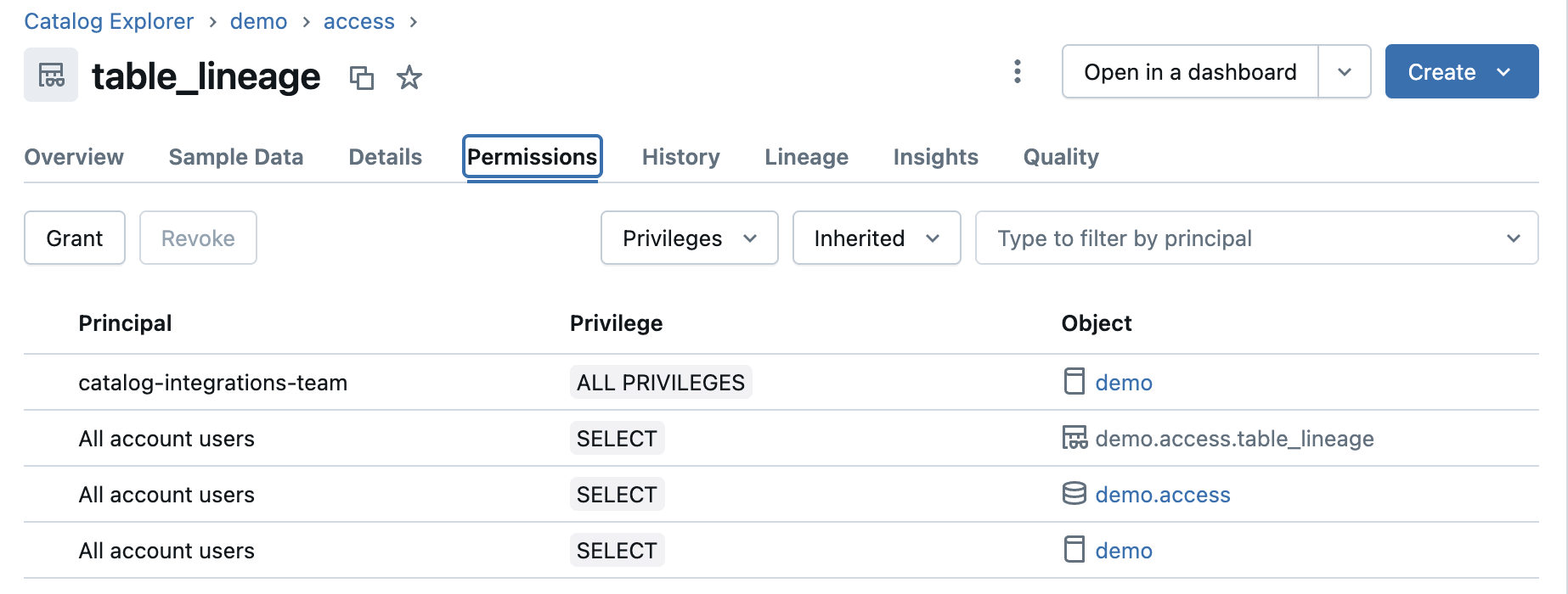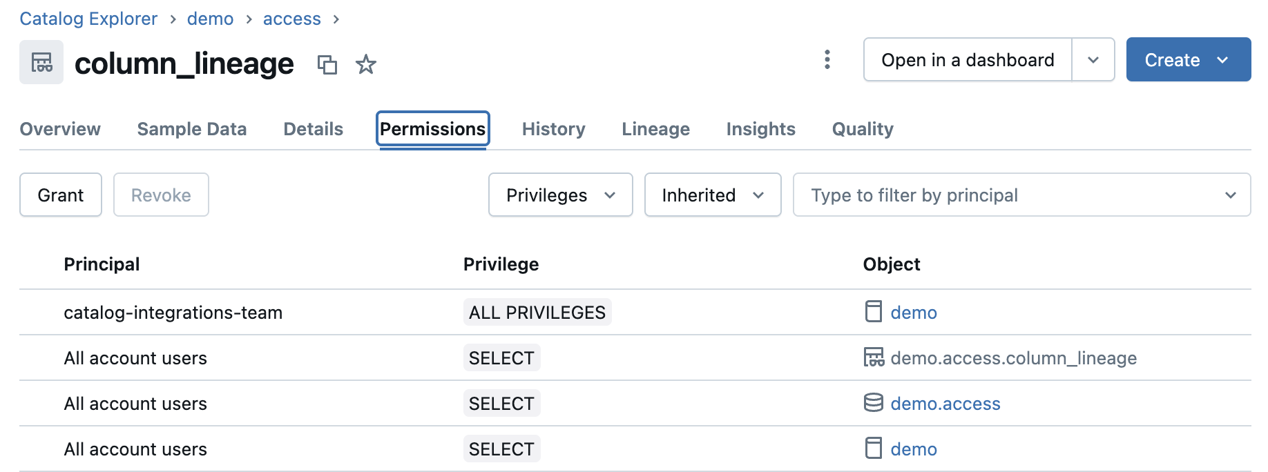 • The following permissions on the system tables or a custom catalog as a workaround if you prefer not to grant permissions to the system tables: