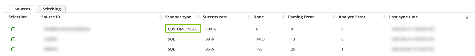 • Collibra Data Lineage creates technical lineage for Databricks Unity Catalog by using the custom technical lineage scanner. Therefore, the scanner type is listed as CUSTOM-LINEAGE on the technical lineage Sources tab page.