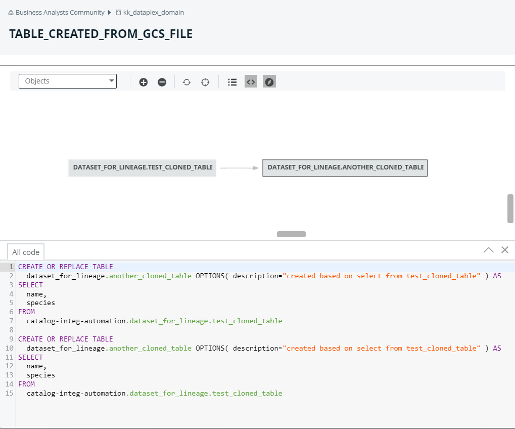 • To view the table-level lineage for Google Dataplex, select Objects in the toolbar of your technical lineage graph.