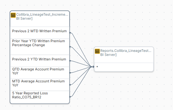- Data objects from your data source that are stitched to assets in Data Catalog and for which you created the technical lineage. These assets have a yellow background. Example