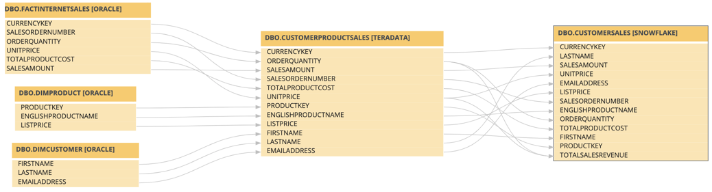 - Data objects from your data source that are stitched to assets in Data Catalog and for which you created the technical lineage. These assets have a yellow background.        Example