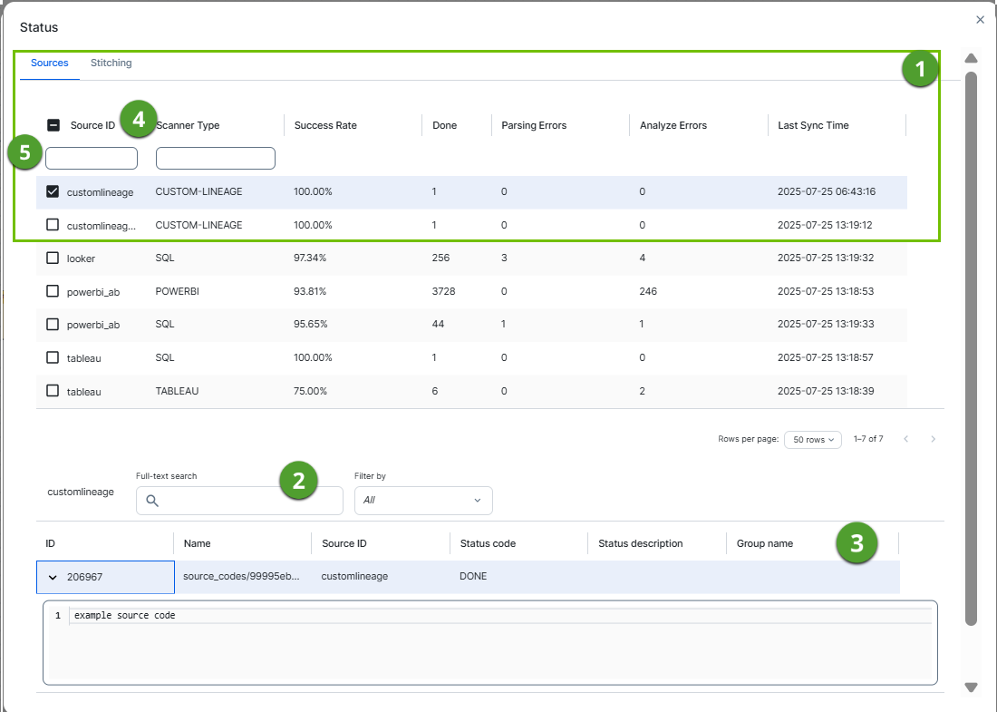 Sort by each column | The sorting icons that you can use to sort by each column in ascending or descending order. These columns include Scanner Type, Success Rate, Done, Parsing Errors, Analyze Errors, and Last Sync Time. |