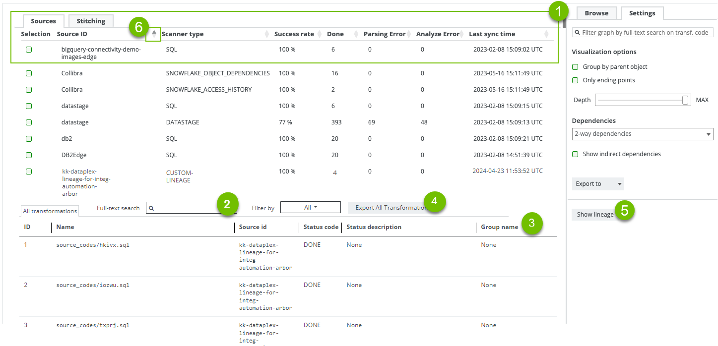 Export Selected Transformations | The button to export transformation details for the selected data sources. When you click this button, you download a ZIP file. The ZIP file contains an errors.csv file that includes the transformation details for the selected data sources. If you do not select any data sources, the transformation details for all listed data sources in the transformations table are exported. |