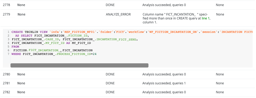 If the analysis results contain errors, the Status code column shows ANALYZE_ERROR and the Name column displays the name of the error. You can find the transformation details by clicking the row.