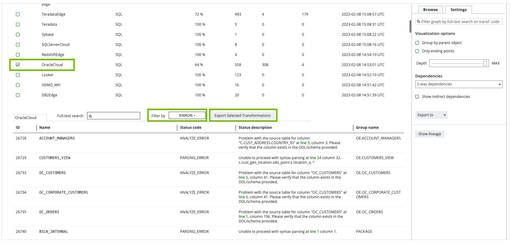 If you want to download analysis and parsing errors for a data source, you can export the transformation details of one or more data sources on the Sources tab page of the technical lineage viewer.