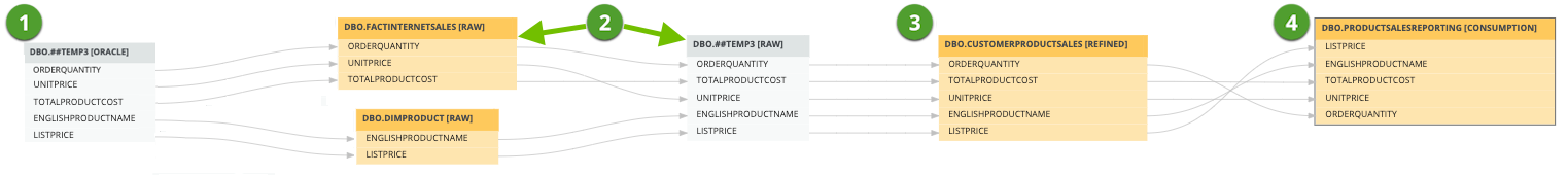 The corresponding business lineage shows only the relations between data objects that have corresponding assets in Data Catalog. In the following image, we see the data flow of assets from the second database, to the third, to the fourth. The first database, Oracle, which is not registered in Collibra, and , is not shown on the diagram.