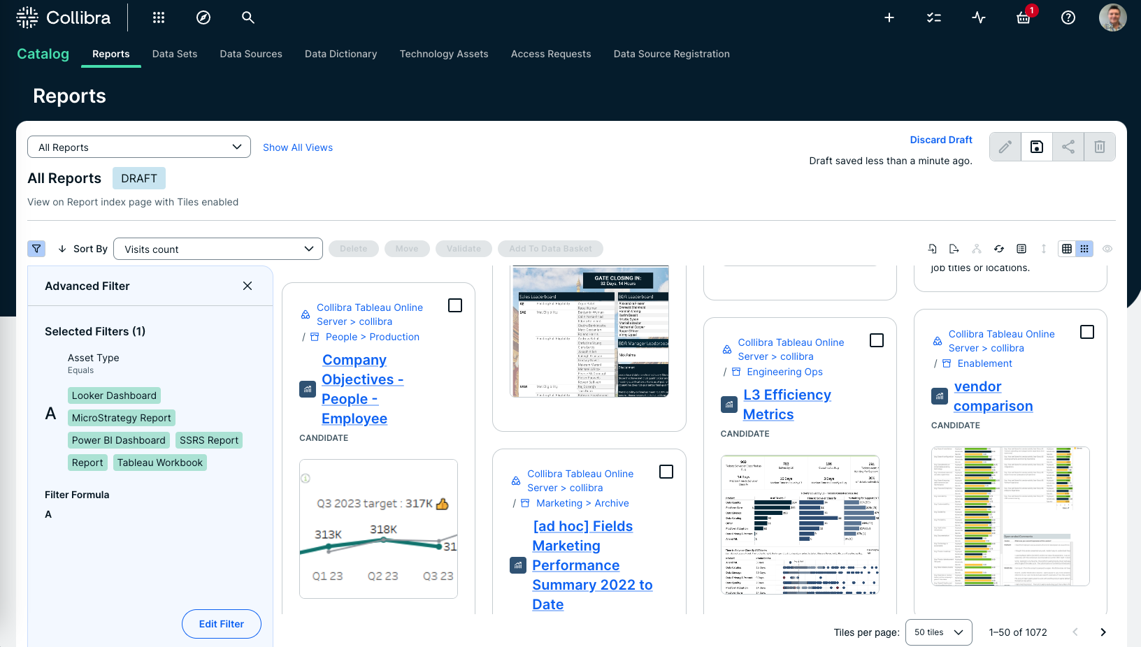 In the Reports tab page in Data Catalog you can see an overview of all BI Report assets and their children. Optionally, you can create a view with a filter to only show, for example, Tableau assets. This is useful if you quickly want to see all reports or if you want find specific reports, for example certified reports or the most frequented reports.