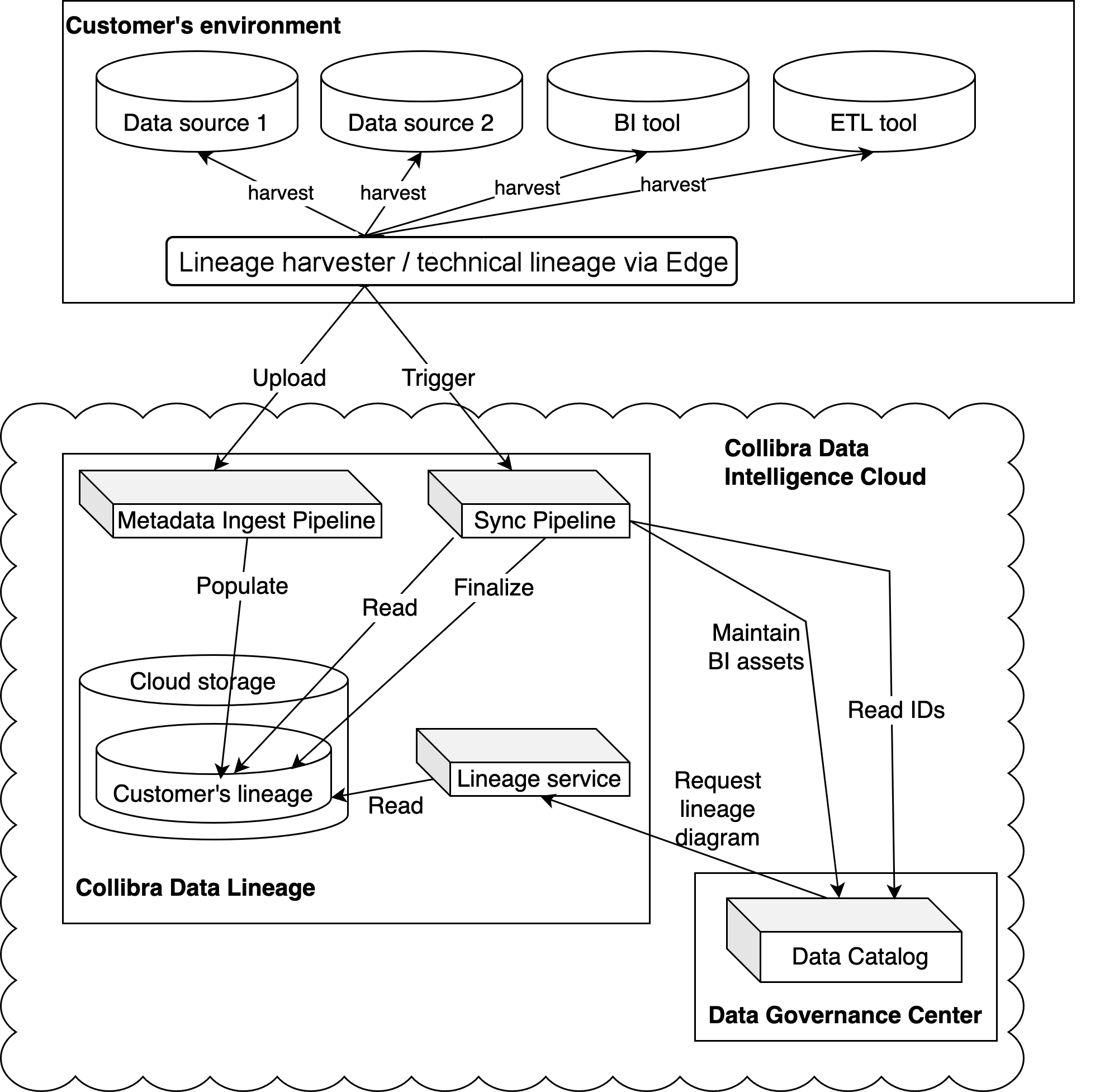 - Analyzing (Metadata Ingest Pipeline): The lineage harvester (deprecated) or technical lineage via Edge uploads the metadata to a Collibra Data Lineage service instance, and the Collibra Data Lineage service instance parses and processes the metadata.