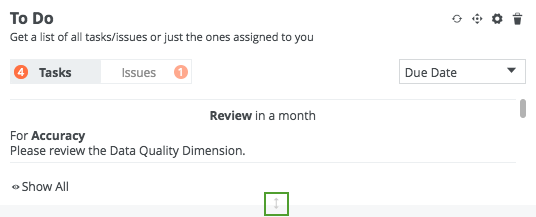 Tip  If several tasks or issues are shown on the widget, you can vertically resize the widget to show more items, eliminating the need for excessive scrolling. To resize the widget, use the bi-directional arrow, which is shown on the widget when you click Edit widgets on the dashboard.