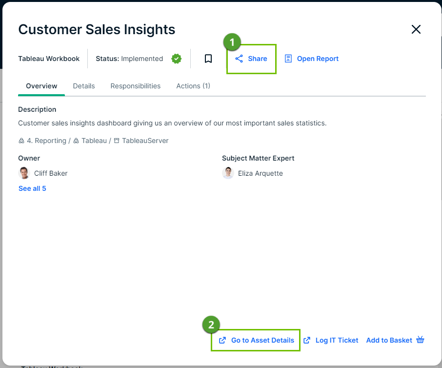 By default, data consumers can share a link to an asset or open the asset in Collibra from the asset preview.