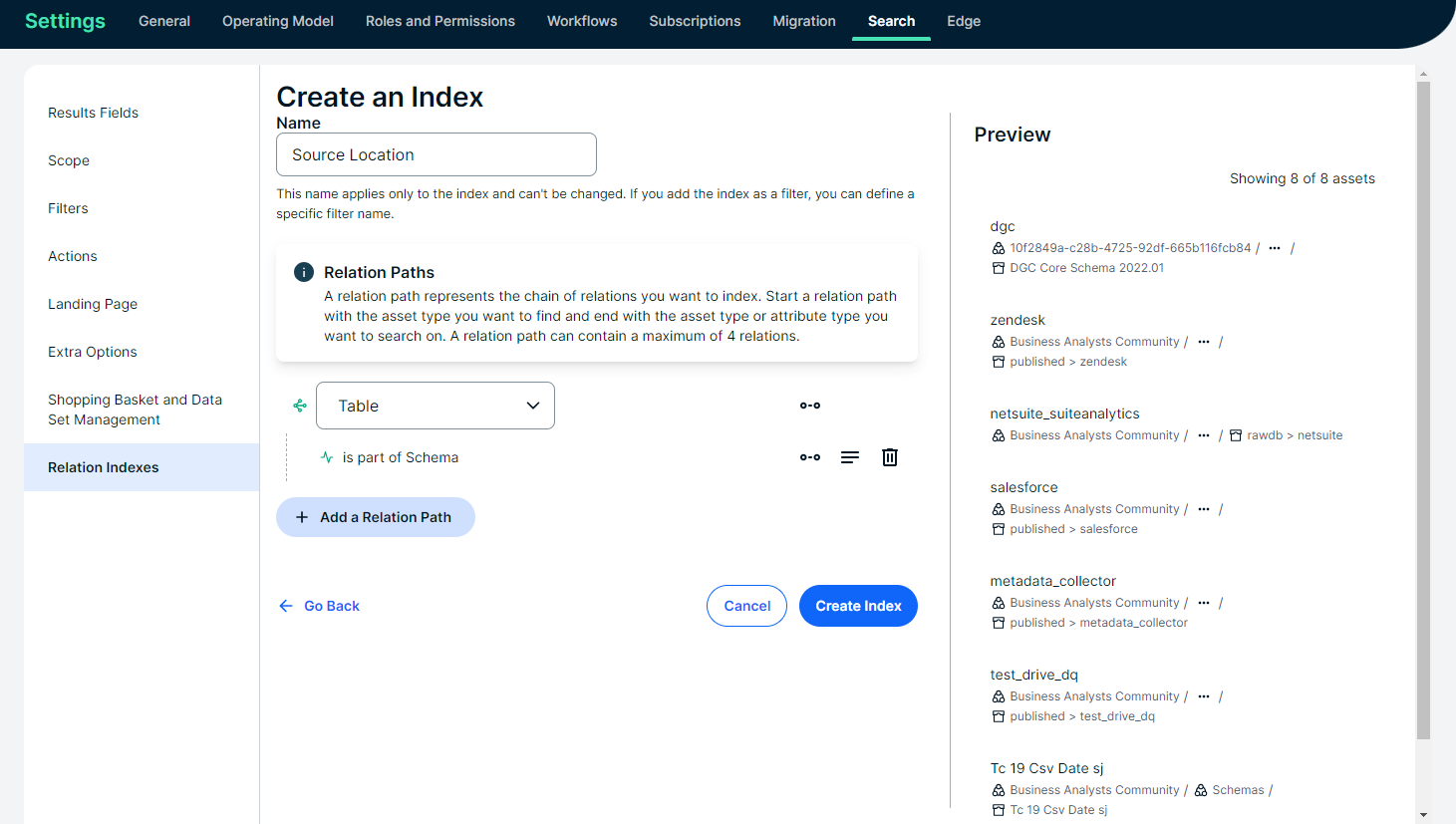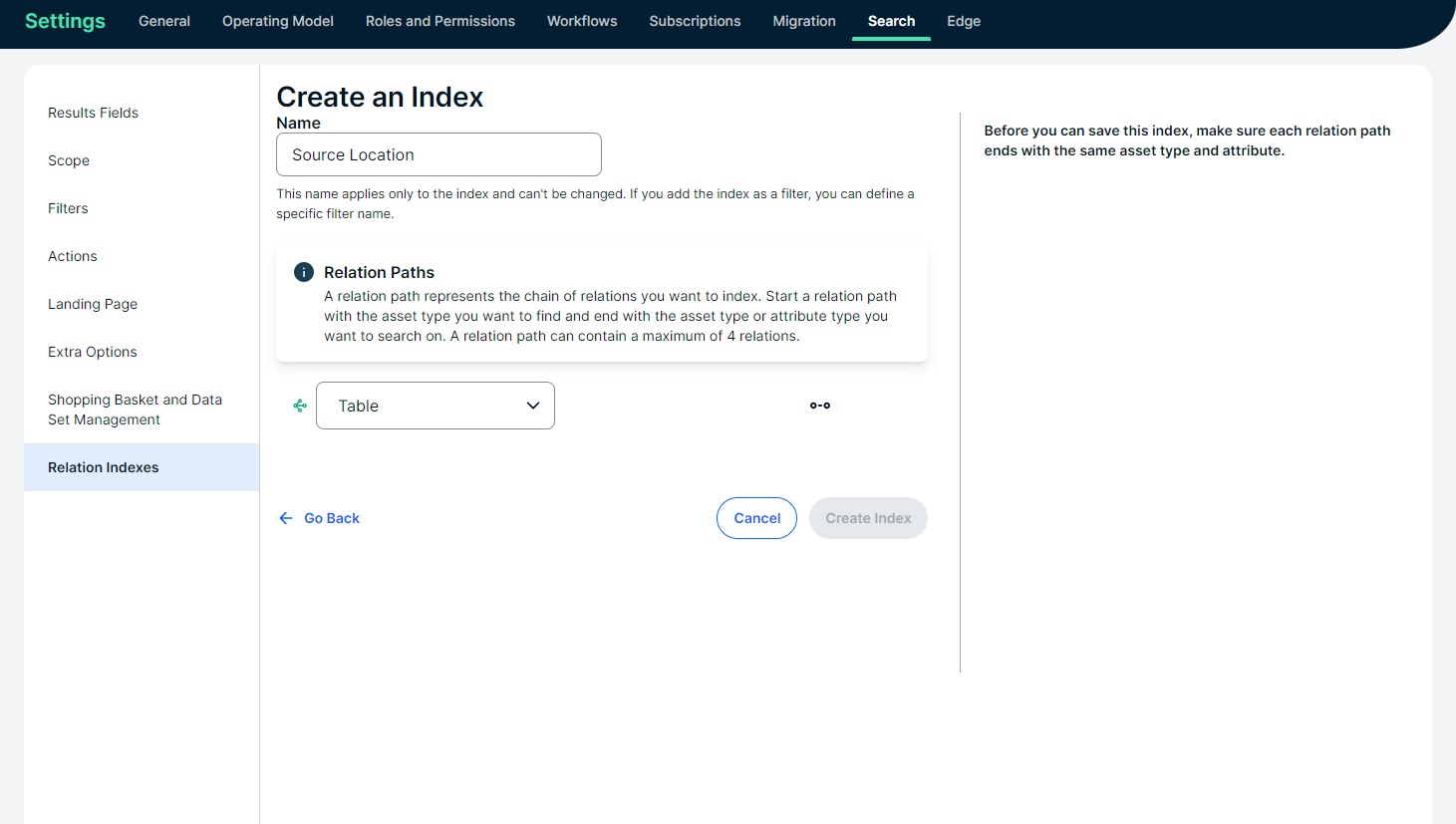 The Manage Relation Indexes page opens. It provides an overview of all relation indexes in the environment.