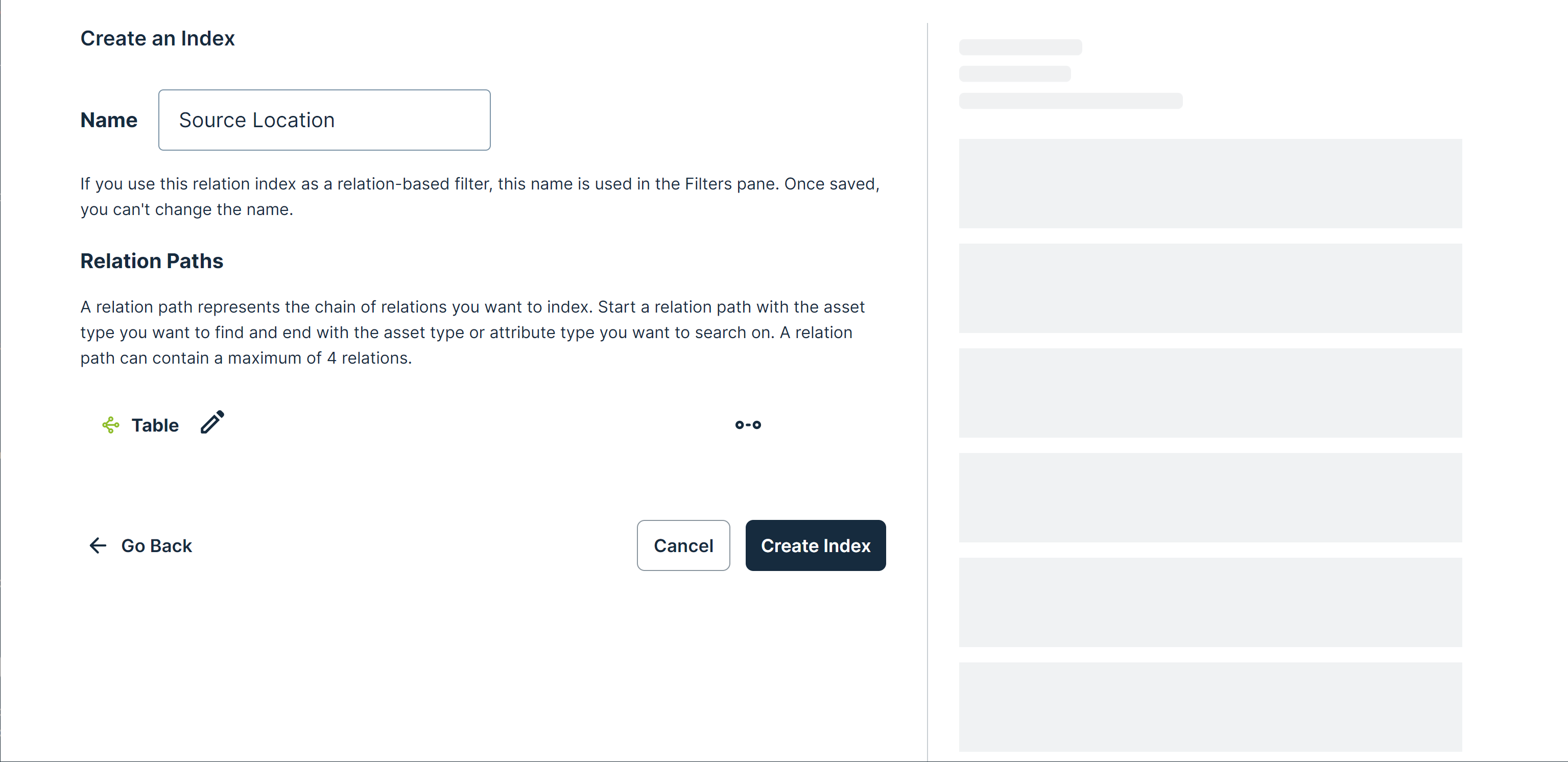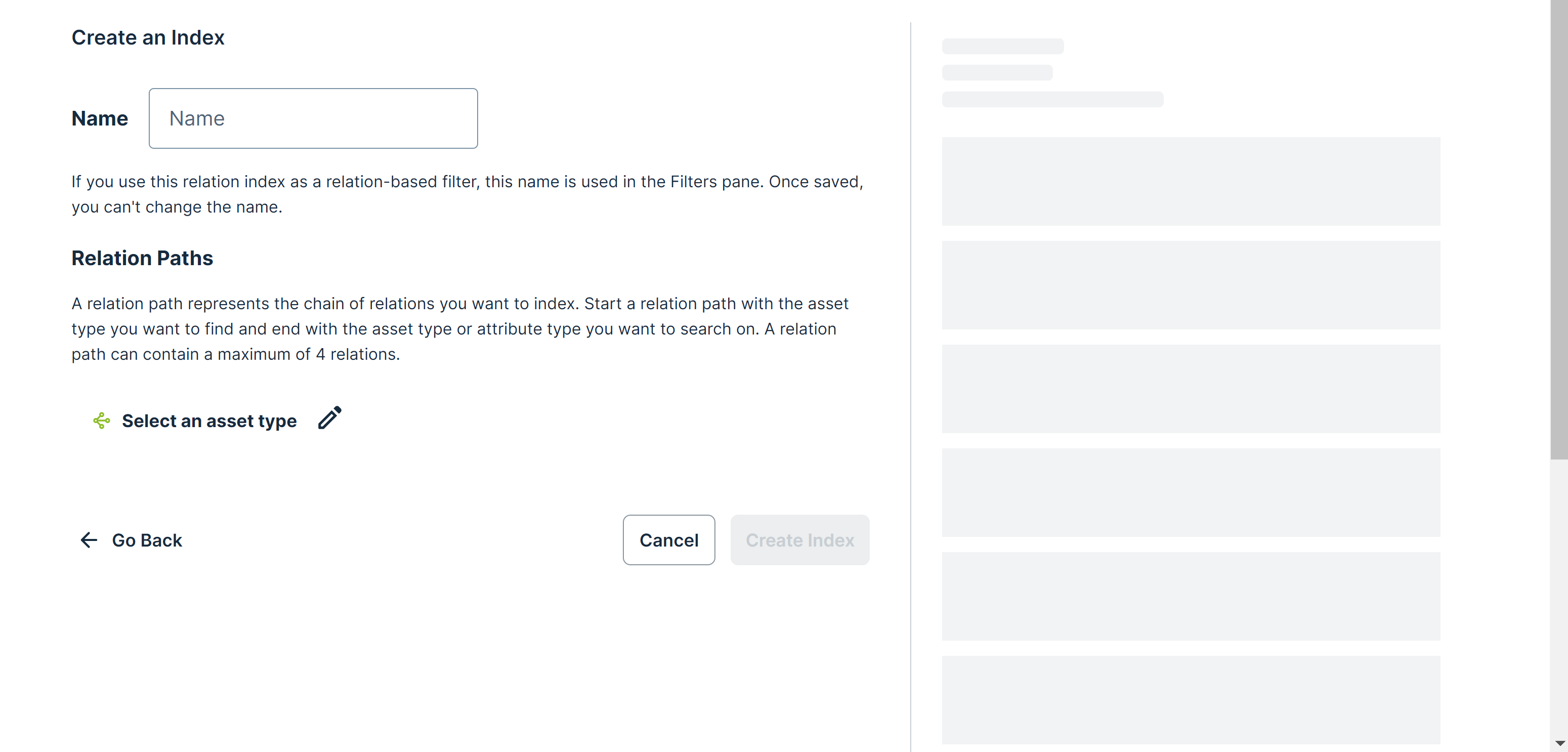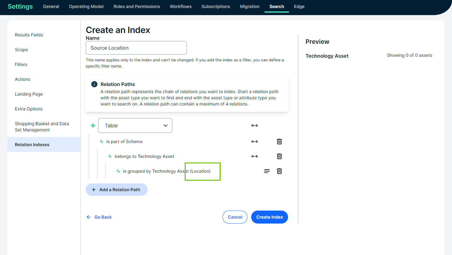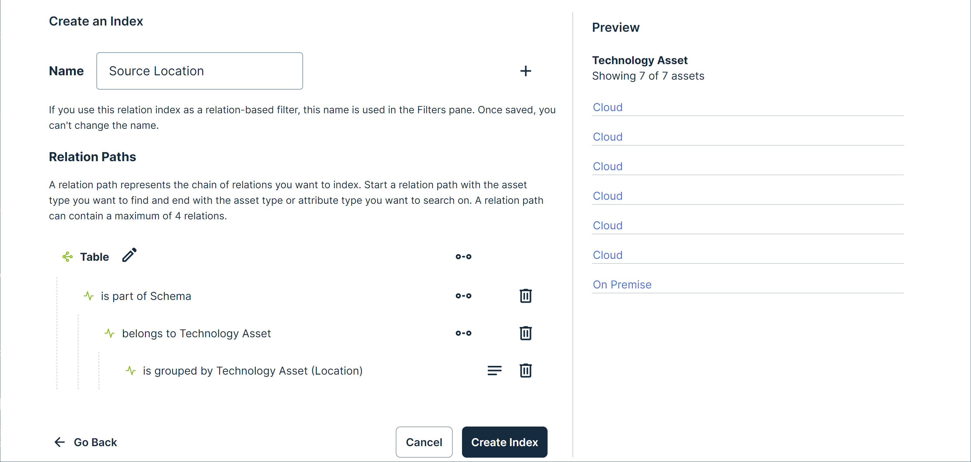 Which asset type or attribute type do you want to filter on? If it is an attribute type, which asset type does it belong to? We want to filter on Location, which belongs to asset type System. This means the last asset type in our relation path must be System.