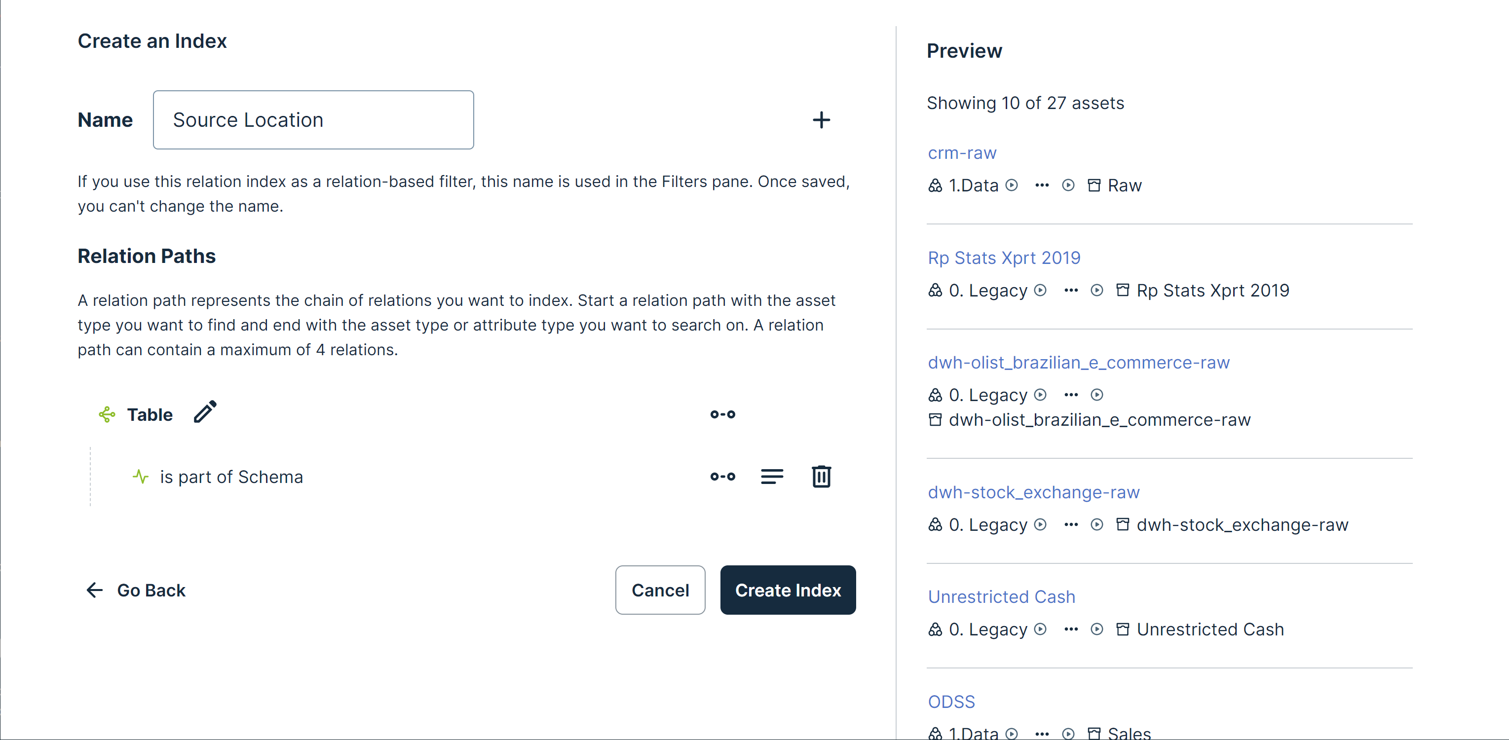 Which asset type (and children) or asset types do you want to filter out? Tables This means the first asset type in our relation path must be Table.