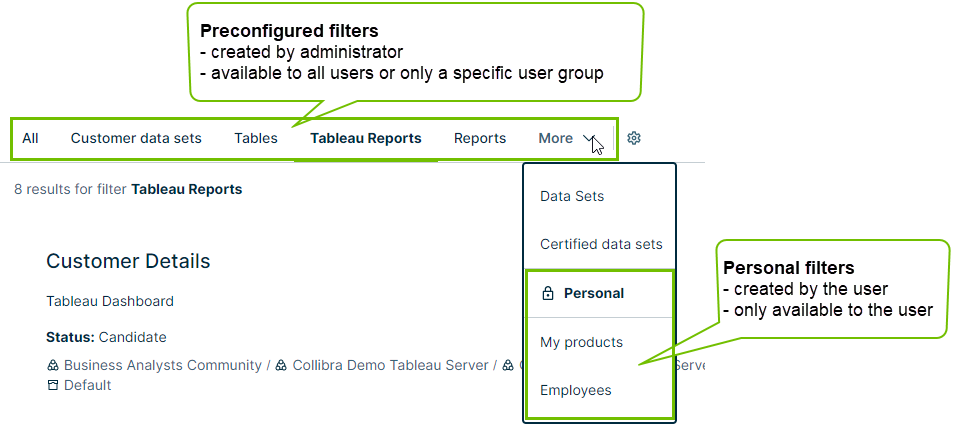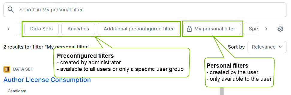 Saved filters are available as links in the landing page and as filter tabs in the Search results page.