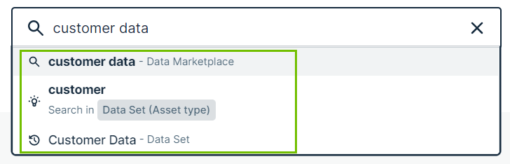 - The first suggestion is based on a recent search action. Clicking this suggestion launches the search for customer data in Data Marketplace again.