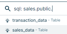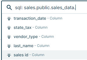 - You want to use the sales_data. If you type sales_data., a list of all columns in that table appears in the search suggestions.