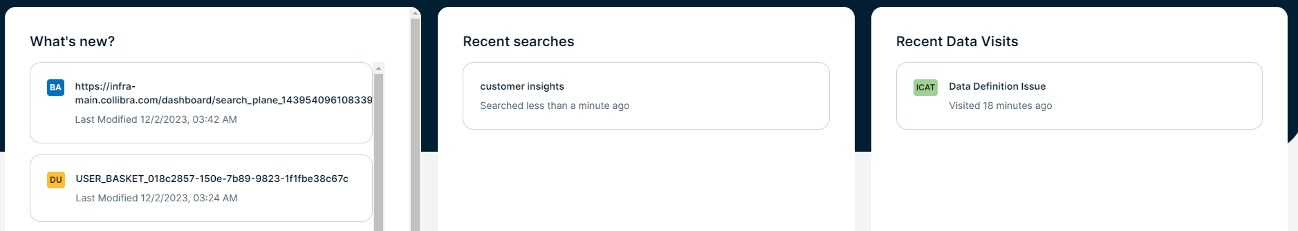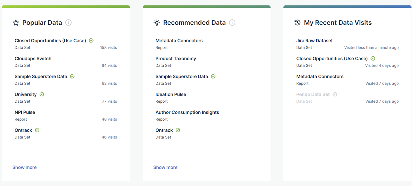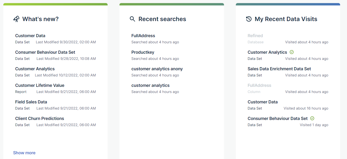 Cards | Cards allow you to navigate quickly to data that might interest you. The available cards depend on whether data discovery is enabled.