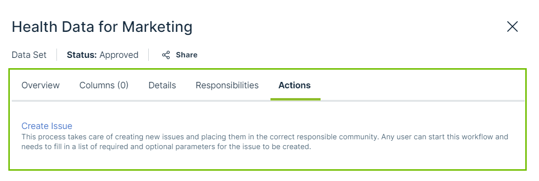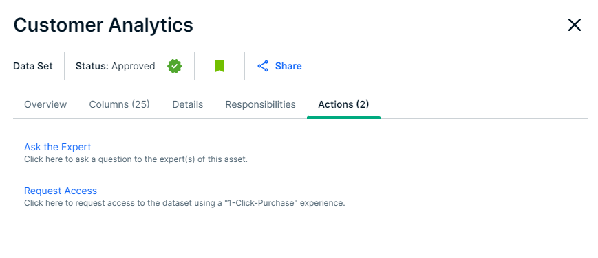 • Actions are based on workflows and their configuration. Workflows can be configured to be available only for certain asset types or users, and they can be paused. If data consumers don't see a specific action, the workflow configuration may give an indication on the reason.