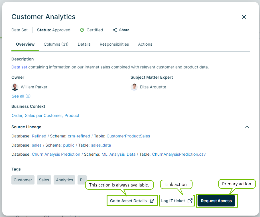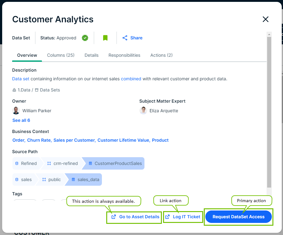 In this example, Request Access is the primary action and Log IT ticket is the link in the asset preview.