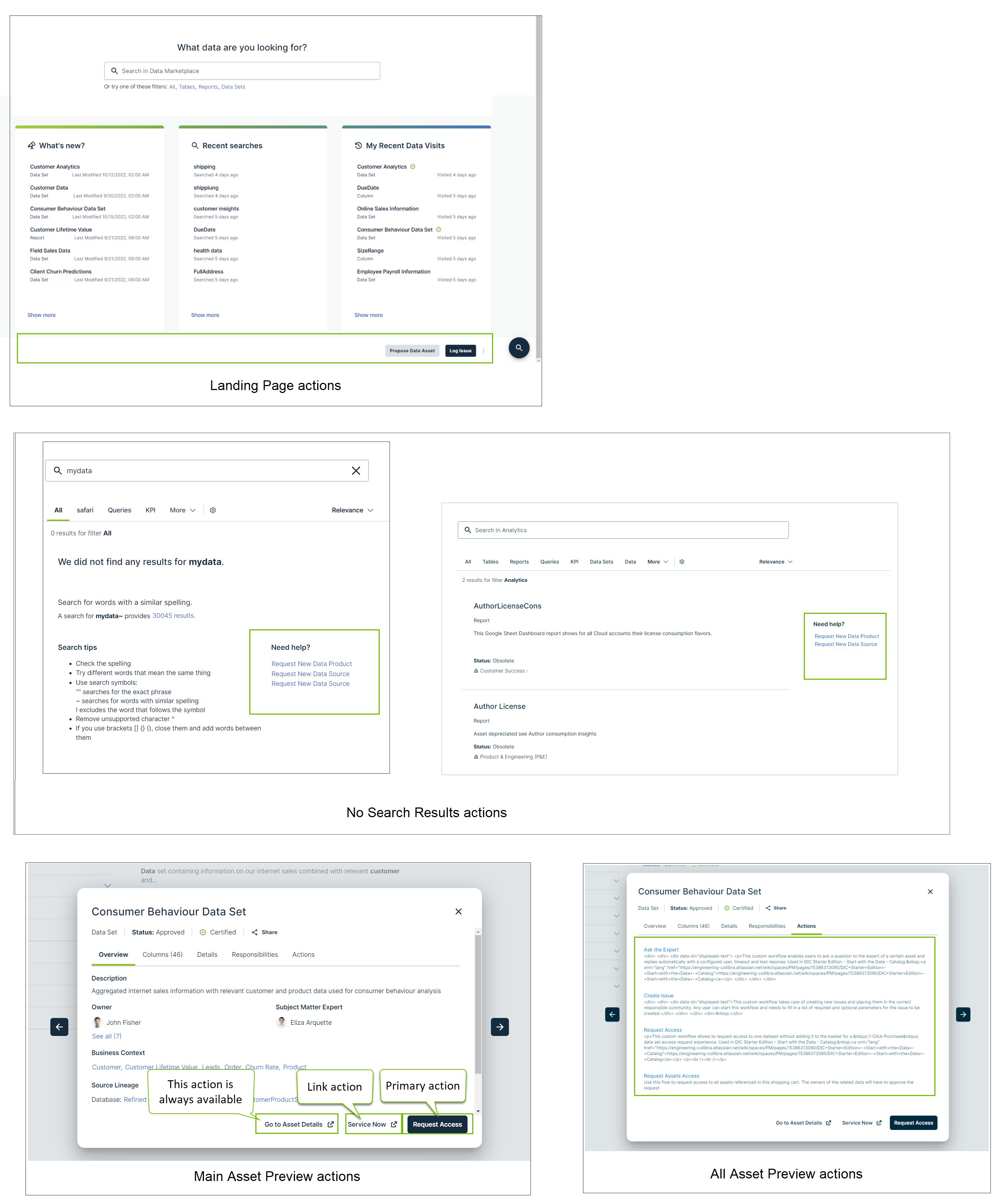 Administrators can add and remove actions. Actions in Data Marketplace start workflows. They can be made available in the following locations: