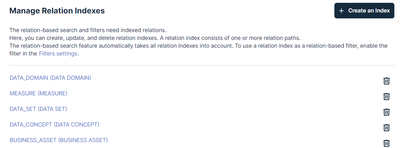 The Manage Relation Indexes page opens. It provides an overview of all relation indexes in the environment. - In the Data Marketplace section, click Filters.