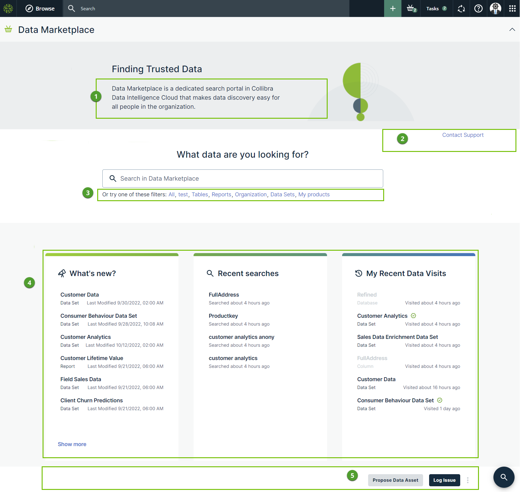 - In the Data Marketplace landing page, you can configure the introduction text (1), the quick links (2), the links to preconfigured filters (3), whether discovery data must be available (4), and the actions (5).