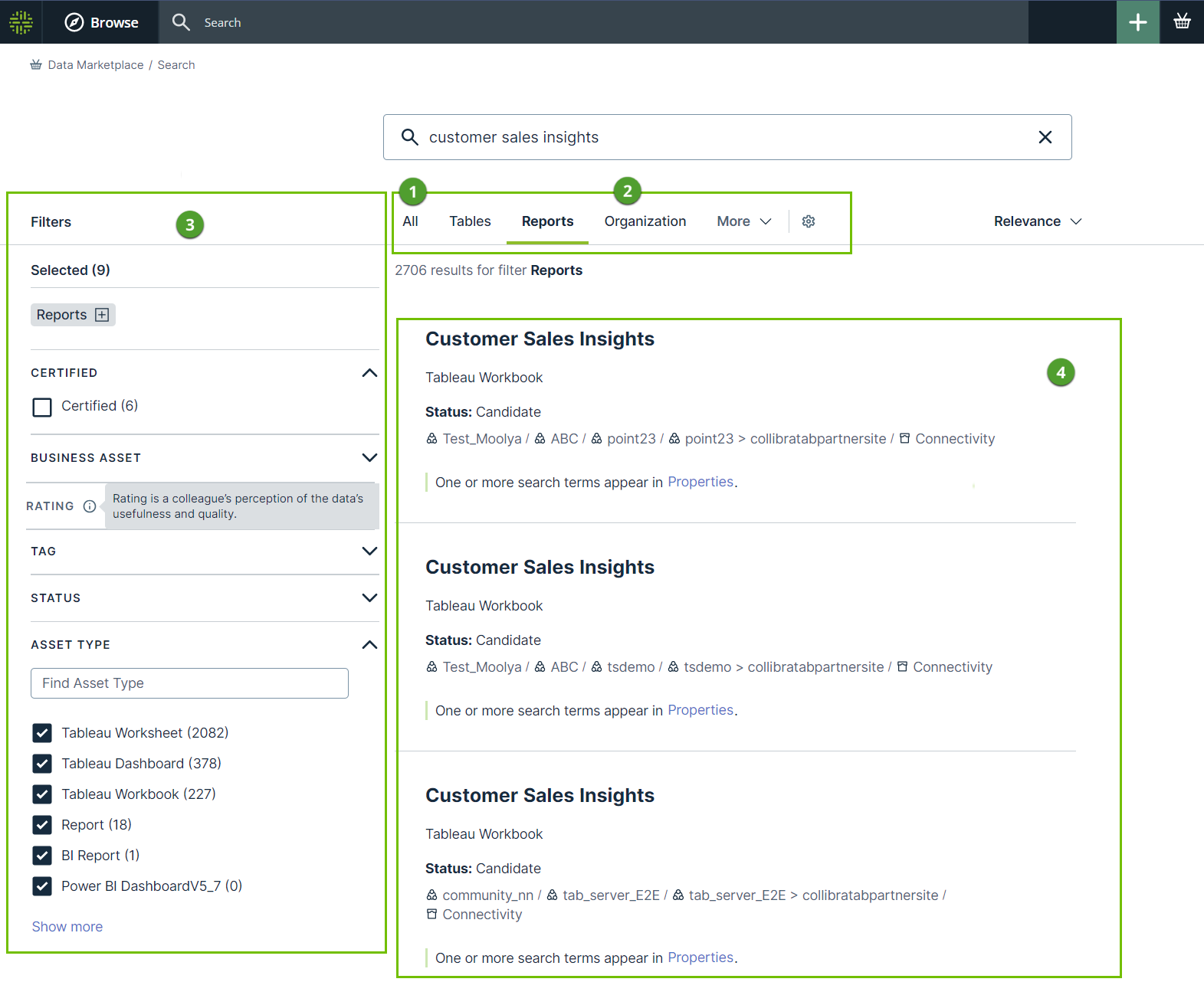By default, Data Marketplace finds assets of all asset types, with any status, anywhere in your organizations. The Data Marketplace scope also allows you to select which for asset type groups must be available when defining relation paths. |