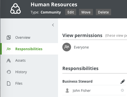 - If the resource is a community, the responsibilities are inherited by subcommunities, domains, and assets in the community. If you are a Business Steward for a certain community, you are a Business Steward for all the domains and assets inside that community.
