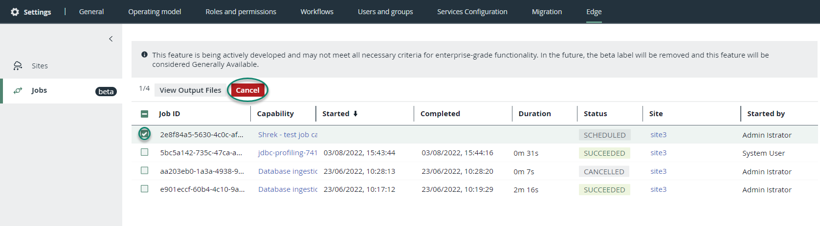 You can cancel an Edge or Collibra Cloud site job which is either running or queued to run.