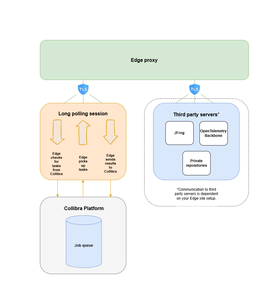 - Private repositories: If you are using a private repository for your Edge site, Edge communicates using HTTPS to send information from your Edge site to Collibra Platform. For more information, go to About private registries with Edge.
