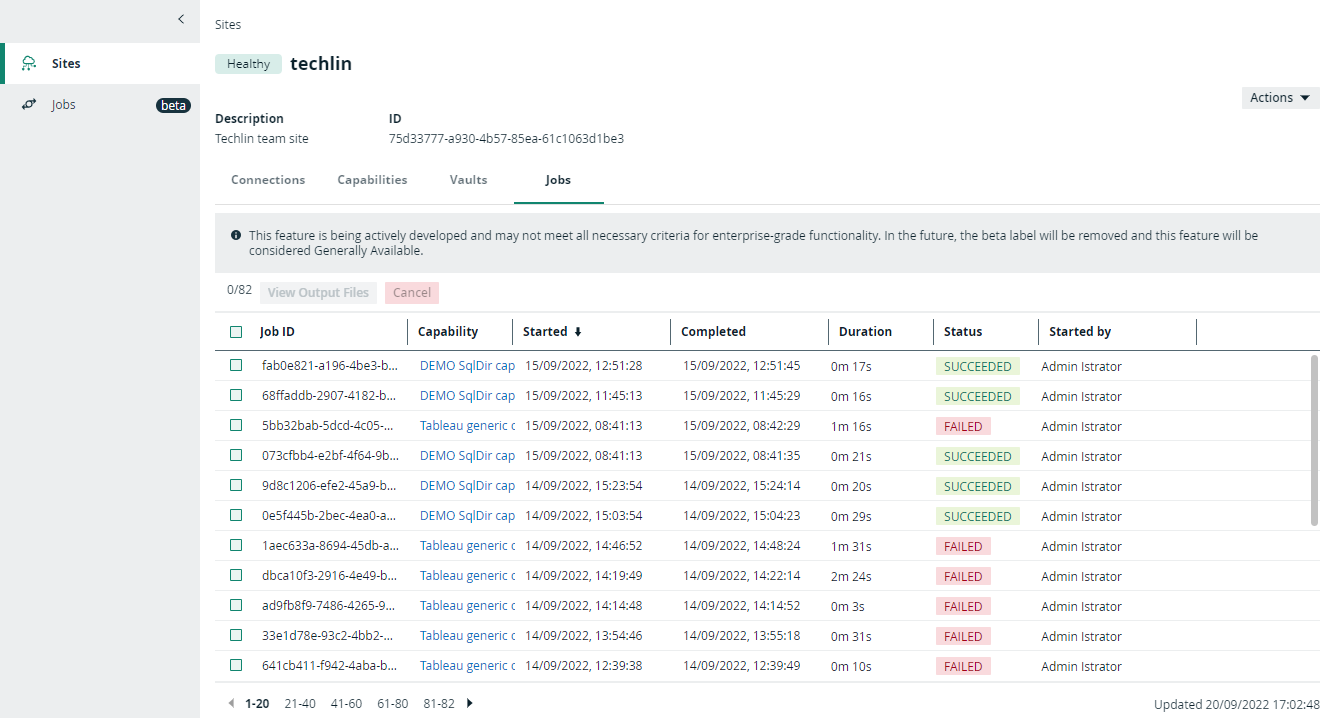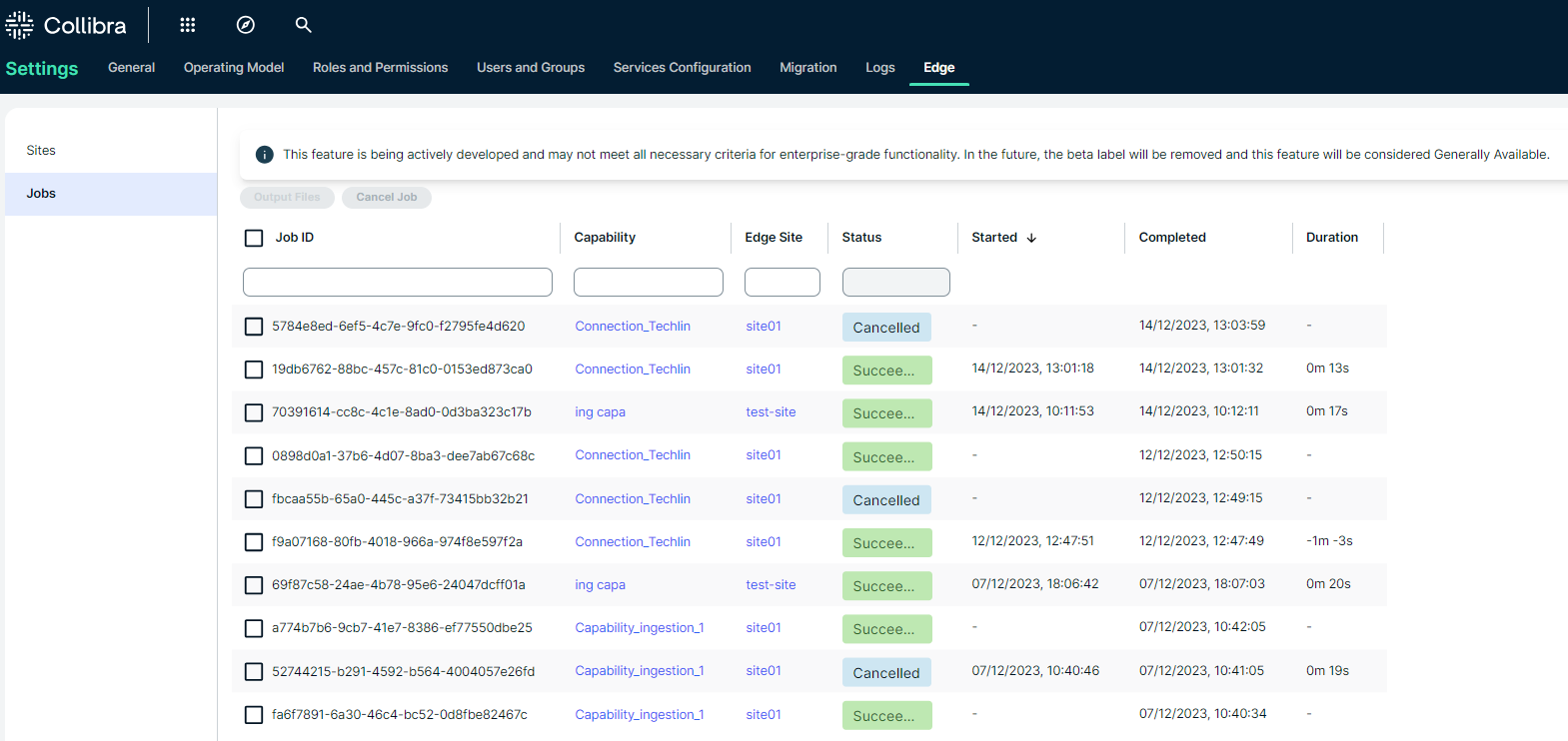 On the Edge Jobs dashboard, you find an overview of all jobs that have either been scheduled or completed in your Edge or Collibra Cloud sites. Each job is a row in the table and contains basic information such as start and completion date, status, Edge or Collibra Cloud site, capability and so on. You can also open the log files of a job and cancel a scheduled job from this dashboard.