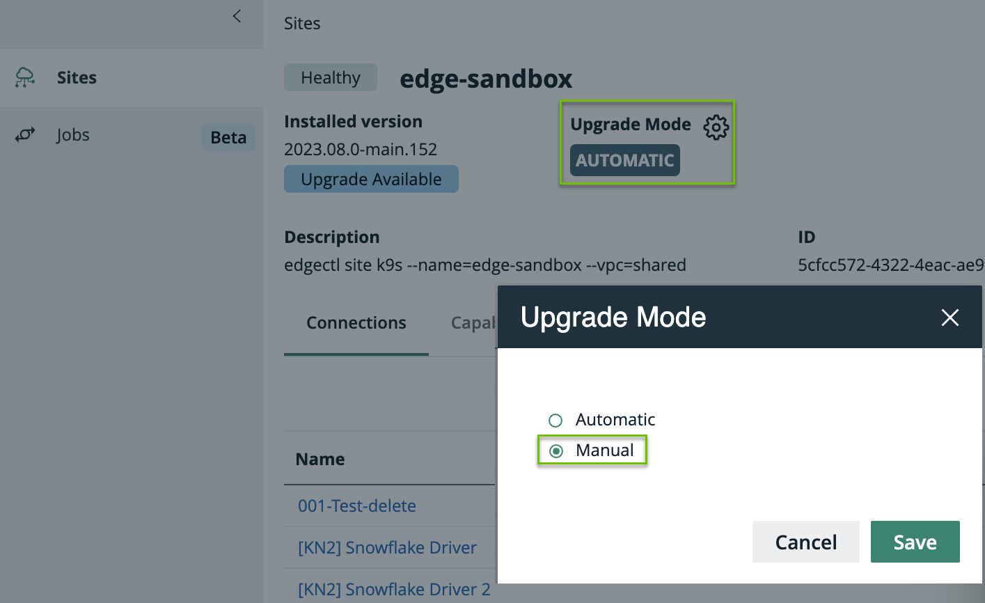You can change the upgrade method to manual for existing Edge sites by following the steps below: