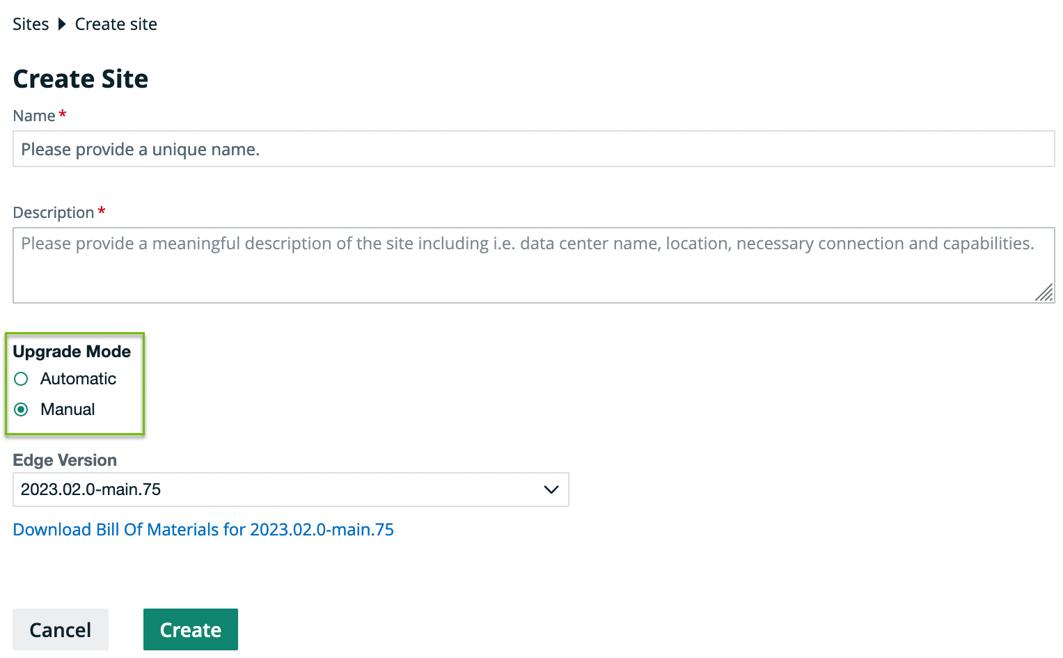 When creating a new Edge site, select Manual under the Upgrade Mode and click Create.