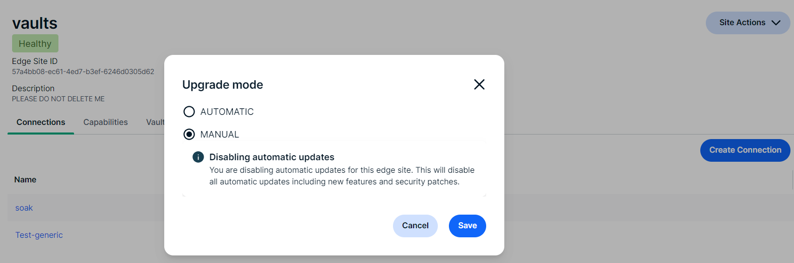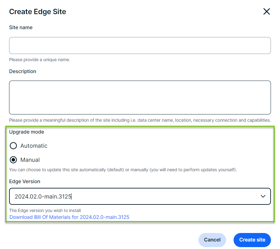 You can enable manual upgrade for new Edge sites or change existing sites to manual upgrade mode. This mode allows you to control when, and to which version, you upgrade your Edge sites to. You can also review the Software Bill of Materials, which outlines what is included in the upgrade, before upgrading your Edge sites.