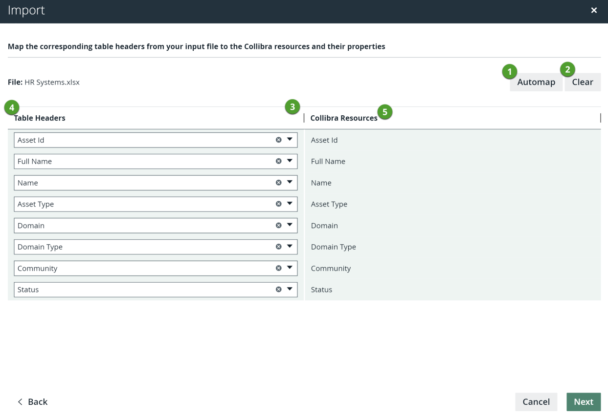 7. Manage the mapping of the fields of the import file and your Collibra resources: